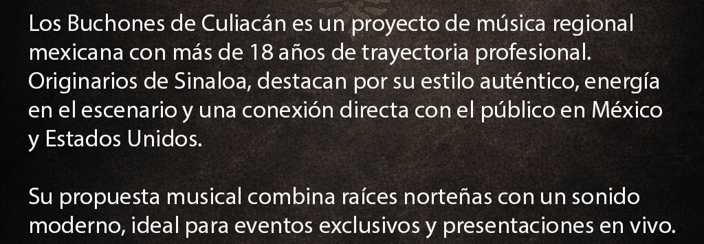Desde Sinaloa para el mundo, Los Buchones de Culiacán representamos la música regional con orgullo, energía y estilo propio.